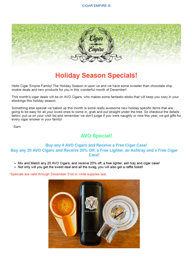 Thus was born the Monthly Cigar Empire Deals and News Letter